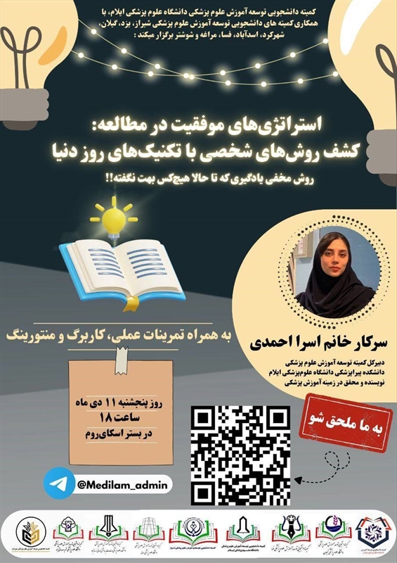 کارگاه آموزشی با عنوان " استراتژیهای موفقیت در مطالعه کشف روشهای شخصی یادگیری با استفاده از تکنیکهای روز دنیا" با توسط کمیته دا انشجویی توسعه آموزش علوم پزشکی دانشگاه علوم پزشکی ایلام، با همکاری کمیتههای دانشجویی توسعه آموزش علوم پزشکی دانشگاههای علوم پزشکی شیراز، یزد، گیلان، شهرکرد، اسدآباد، فسا، مراغه و شوشتر روز پنجشنبه ۱۱ دیماه ساعت18 در بستر اسکای روم برگزار گردید.